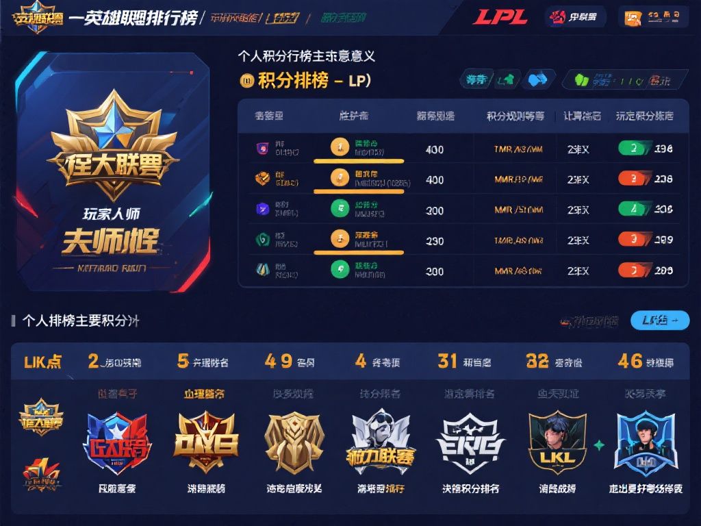 英雄联盟的积分排行榜主要分为两种:一是玩家个人在排位赛中的段位与积分排名,二是职业联赛(如LPL、LCK等)中战队的积分榜。个人排行榜以胜点(LP)为核心,通过胜负关系和隐藏分(MMR)计算玩家的实力水平。而职业联赛积分榜则根据比赛胜场、积分规则等综合评定,直接决定季后赛资格。